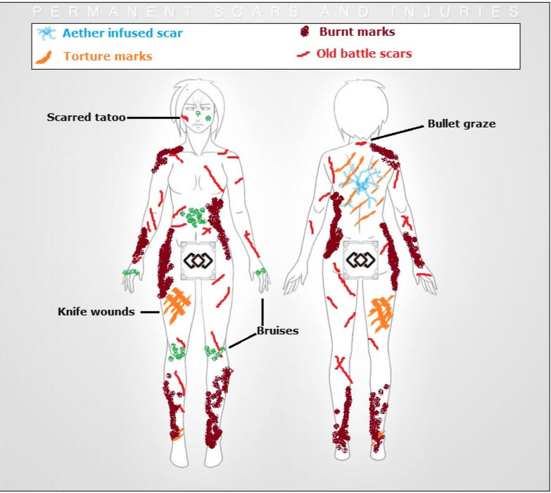 Battle scars: left cheek, neck, back, left arm, right arm, left shoulder, right shoulder, abdomen, left leg, right leg.